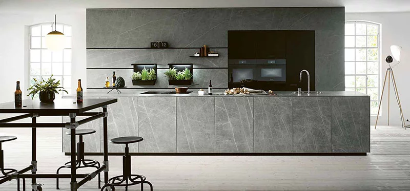 אם נבקש לשמור על עיצוב מינימליסטי יהיה נכון לשמור על מיעוט חומרים כדי לקבל תצוגה אסתטית נקייה. שימוש באותו החומר גם למשטח העבודה וגם לקירות תהיה בחירה טובה והרמונית. במקרה כזה, המטבח יוכל להציג שני חומרים בלבד: חזית הדלתות ומשטחי העבודה וחיפויי הקירות. חיפוי קירות מאבן הוא חיפוי בעל נוכחות שללא ספק יוסיף למטבח מוקד כוח עיצובי מרשים.